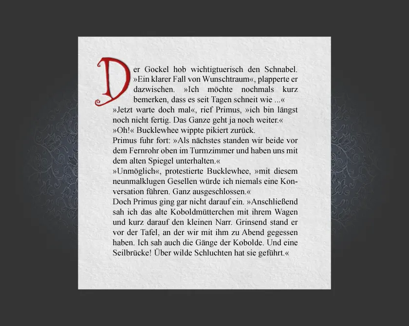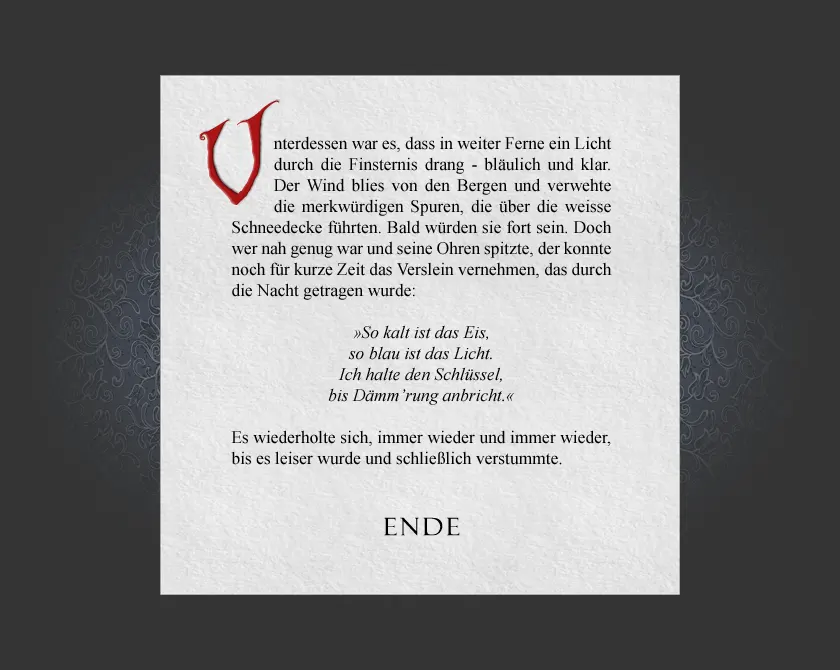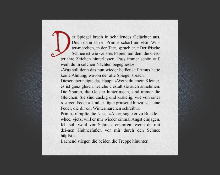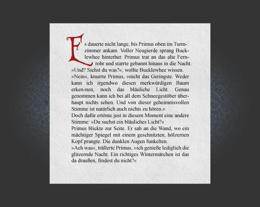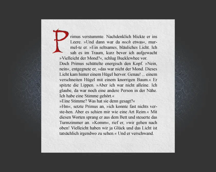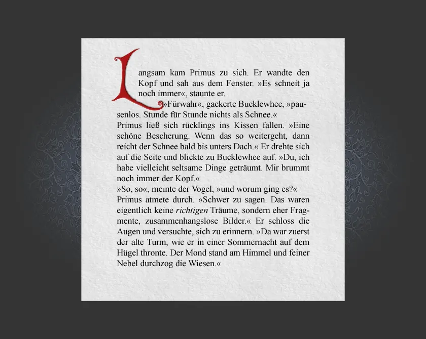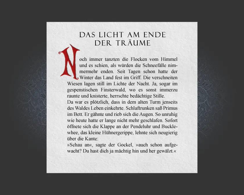 Etwas geschah vor langer Zeit – in einer eisigen Winternacht, als der Schneesturm über das Land fegte. Seltsame Träume suchten Primus heim; Träume, deren Bilder er noch lange vor Augen hatte. Doch eines der Bilder entschwand aus Primus’ Gedächtnis … ohne die geringste Spur.